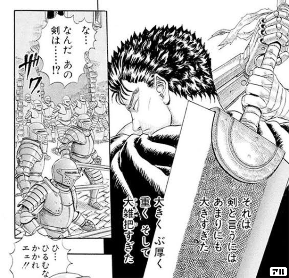 それは剣と言うにはあまりにも大きすぎた 大きくぶ厚く重くそして大雑把すぎた な なんだあの剣は ザワ ひ ひるむな かかれェェ ベルセルク アル